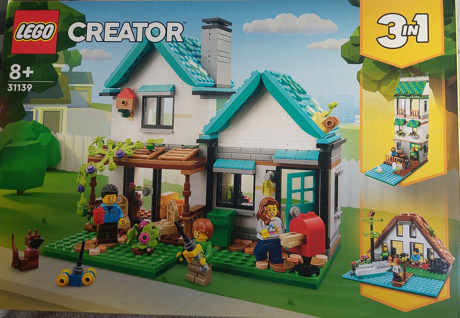 Dieses Set ist brandneu, in der Schachtel und wurde nie geöffnet. Dieses Set enthält 3 Modelle in 1: ein Einfamilienhaus, ein Haus am Kanal und ein Haus am See. Es enthält das folgende Zubehör: Terrassenmöbel Briefkasten mit Briefen Ein Hund 2 Papierboote Feuerstelle Boot. Das Set enthält außerdem 3 Minifiguren: 2 Erwachsene und 1 Kind.