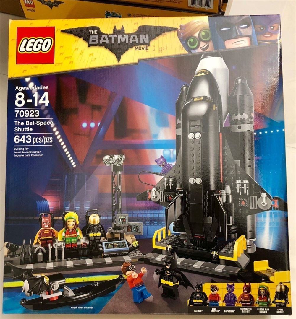 Starten Sie zu einer Weltraummission aus der Batcave in THE LEGO® BATMAN MOVIE 70923 The Bat-Space Shuttle. Das Shuttle hat einen abnehmbaren Triple-Booster-Pack, 4 Bolzenschützen und ein offenes Hinterteil mit einem Bat-Moon Buggy für eine Minifigur zum Fahren. Die Batcave verfügt über ein Dock für das Shuttle, ein weiteres Batman™ Fahrzeug - das Bat-Kayak - mit einem drehbaren Display-Ständer, einem Waffengestell und einer verschiebbaren Trachtenschiene mit 3 abnehmbaren Kostümminifiguren. Dieses Spielset enthält auch 6 LEGO Minifiguren mit Waffen, um Ihre Lieblingsszenen aus dem Erfolgsfilm zu spielen, nachzubilden und neu zu gestalten. Enthält 6 LEGO® Minifiguren: Batman™, Dick Grayson™, Catwoman™, Reggae Man Batsuit, Space Batsuit und Firestarter Batsuit. Dieses actiongeladene THE LEGO® BATMAN MOVIE Set enthält The Bat-Space Shuttle, Bat-Moon Buggy, Batcave und Bat-Kayak. Bat-Space Shuttle verfügt über ein abnehmbares Dreifach-Boosterpack, ein Shuttle mit einem offenen Minifiguren-Cockpit, 2 Bolzenschützen an jedem Flügel und ein offenes Hinterfach mit dem Bat-Moon Buggy mit verstellbarer Antenne und Minifigurensitz. Die Batcave verfügt über ein Dock für das Bat-Space Shuttle, Bat-Kajak mit drehbarem Display-Ständer, eine verschiebbare Kostümschiene mit abnehmbaren Reggae-Man-Batsuit, Space-Batsuit und Firestarter-Batsuit-Minifiguren, Computertastatur und Bildschirmelemente, Waffengestell mit 2 Batarangs, 3 Pfeilen und einem Enterhaken für die Greifkanone sowie rotierenden "Reflektoren". Schieben Sie die Kostümschiene und wählen Sie aus 3 verschiedenen Kostümminifiguren. Zu den Waffen gehören Batmans Enterhakenkanone und Catwoman's Peitsche. Reggae Man Batsuit, Space Batsuit und Firestarter Batsuit Kostüm Minifiguren sind neu für Januar 2018. Füge dieses Set zu 70909 Batcave Break-in hinzu, um eine erweiterte Batcave zu erstellen. Das Bat-Space Shuttle ist über 11 cm (4") hoch, 29 cm (11") lang und 20 cm (7") breit. Der Bat-Moon Buggy ist über 5 cm (1") hoch, 5 cm (1") lang und 3 cm (1") breit. Batcave misst über 5" (13cm) hoch, 13" (34cm) breit und 6" (16cm) tief. Bat-Kajak ist über 3 cm (1") hoch, 12 cm (4") lang und 2 cm (1") breit.