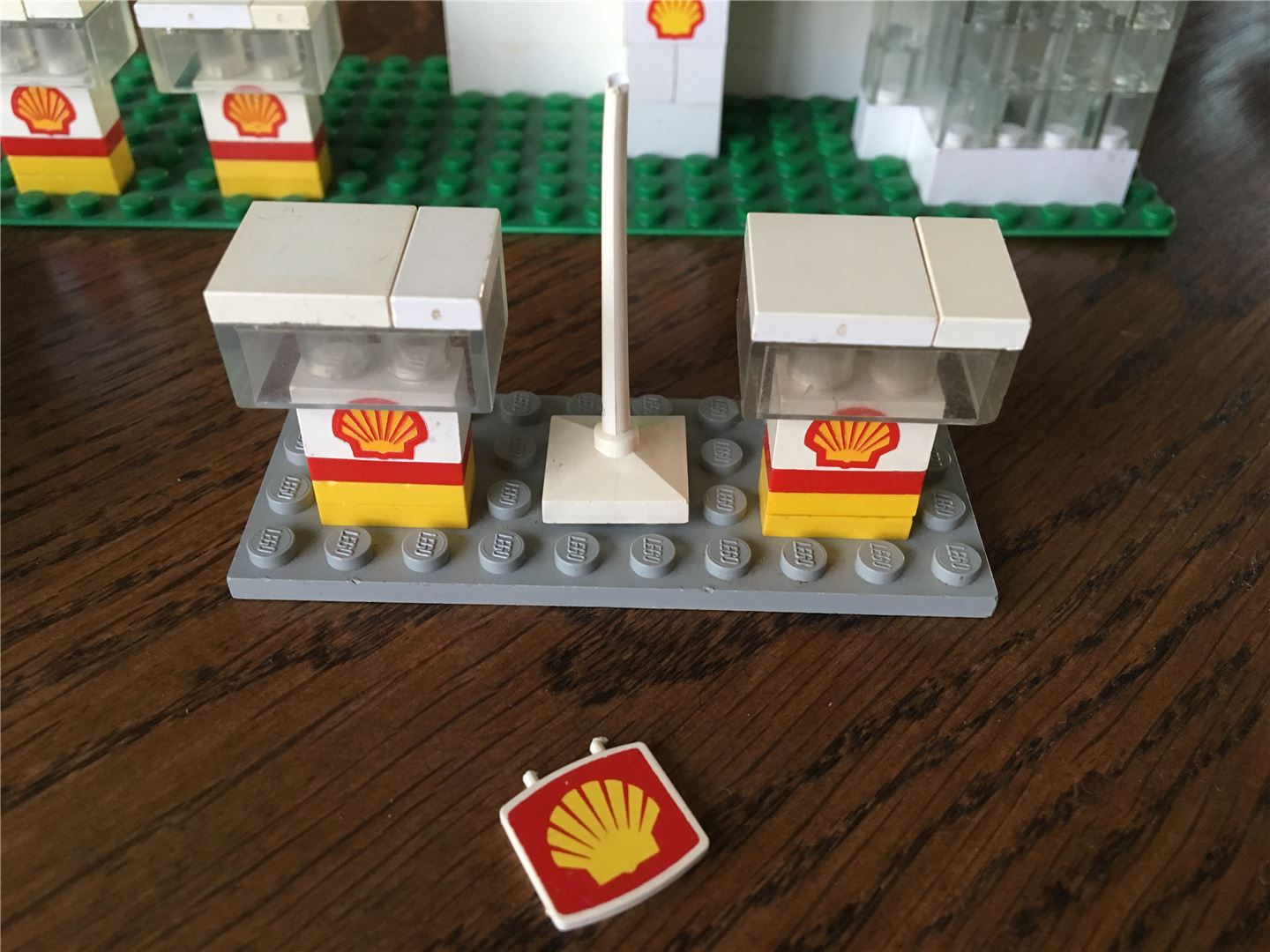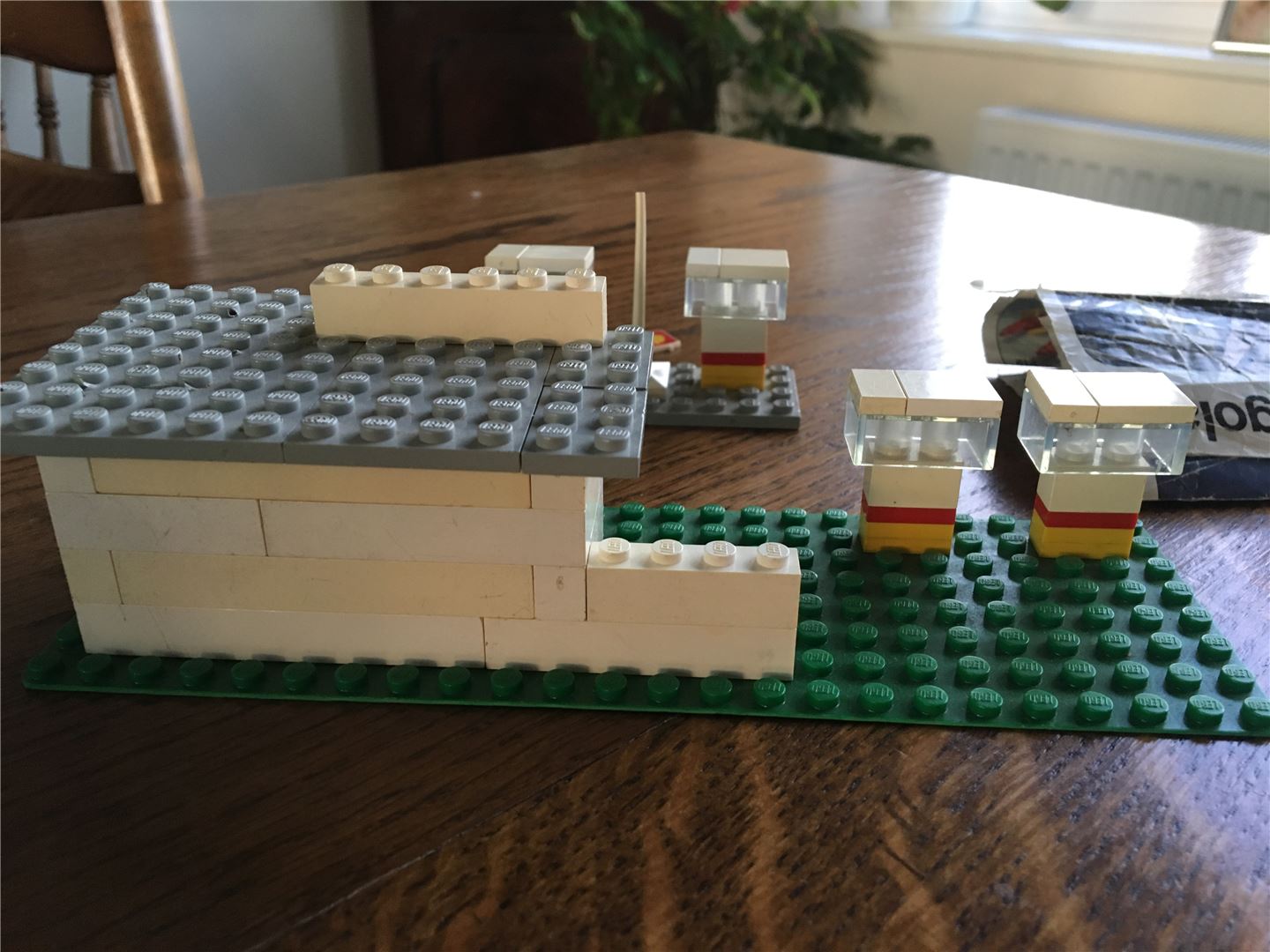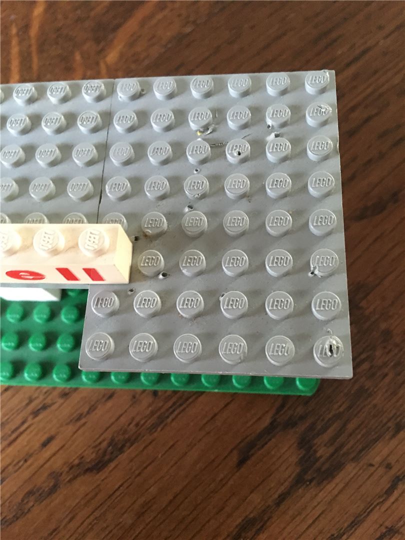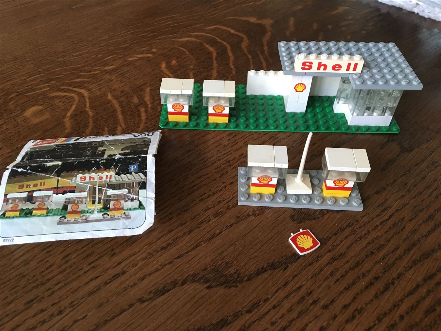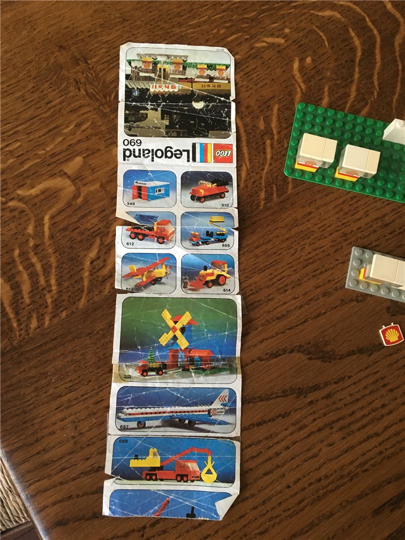 Lego Classic City 690 Tankstelle mit Anleitung ohne Box 1974. Dieses Vintage-Set zeigt sein Alter mit Verfärbungen von Ziegeln und einigen Schäden, die ich auf Fotos zu zeigen versucht habe. Der Wegweiser ist gebrochen und die gelbe Tür fehlt. Bedingung ist verwendet.